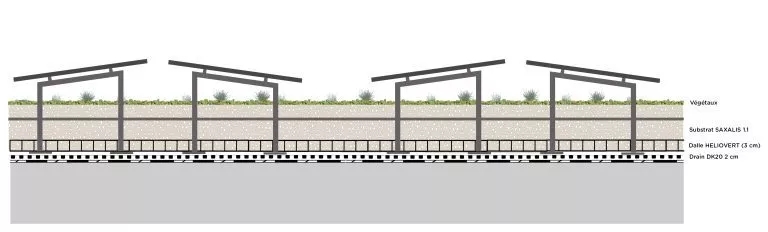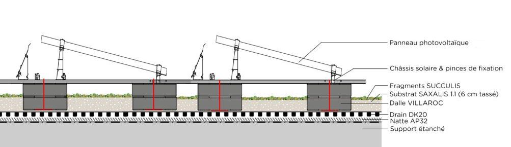 Composition du système de bas en haut : Etanchéité anti-racines, Drain à rétention d'eau, Dalle, Châssis, Substrat, Végétation, panneau photovoltaïque